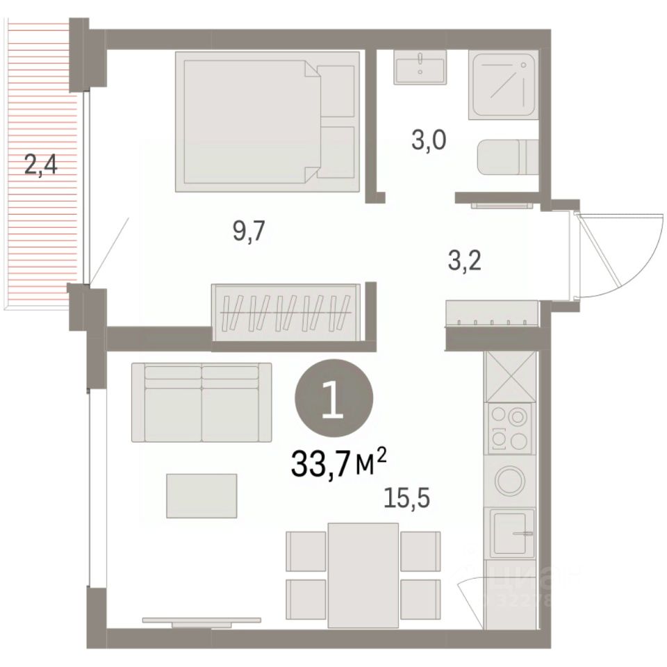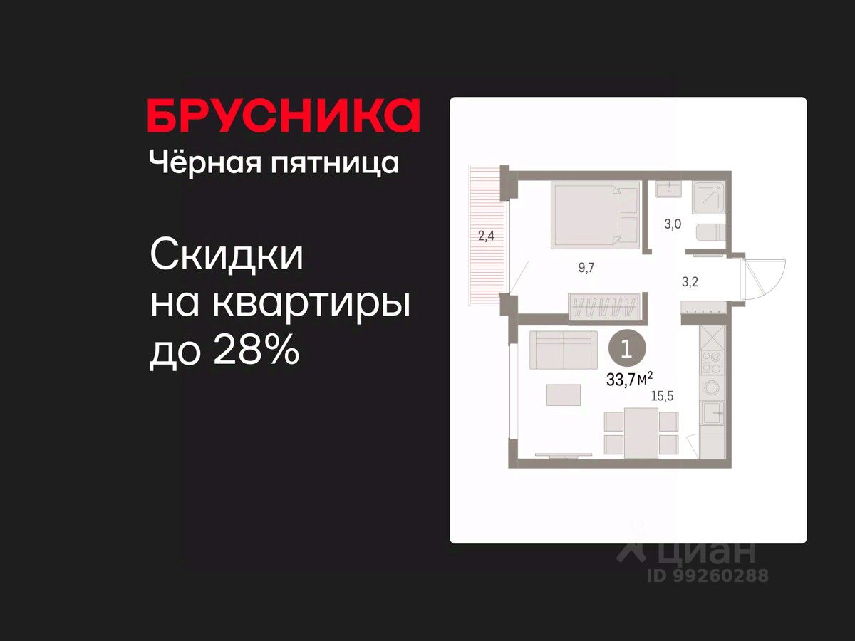 Квартира с кухней-гостиной и одной спальней в Бруснике в Академическом. Особенности планировки: предчистовая отделка, балкон.