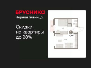 Квартира с кухней-гостиной и одной спальней в Бруснике в Академическом. Особенности планировки: предчистовая отделка, балкон.