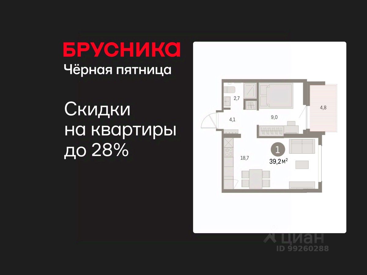 Квартира с кухней-гостиной и одной спальней в Бруснике в Академическом. Особенности планировки: предчистовая отделка, балкон.
