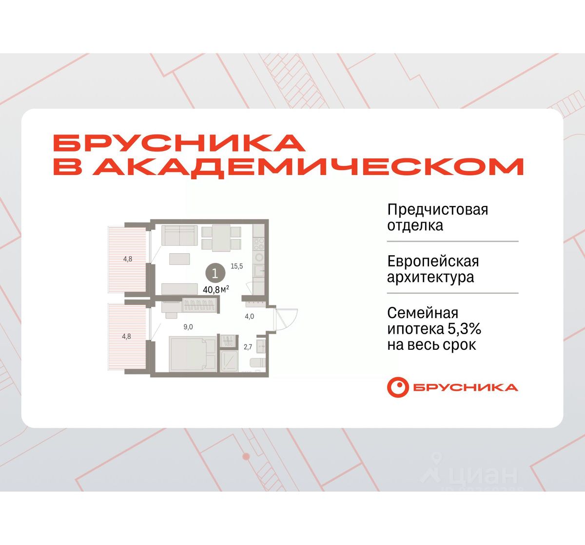 Квартира с кухней-гостиной и одной спальней в Бруснике в Академическом. Особенности планировки: предчистовая отделка, балкон.