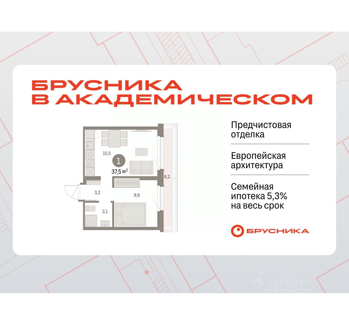 Квартира с кухней-гостиной и одной спальней в Бруснике в Академическом. Особенности планировки: предчистовая отделка, терраса на крыше.