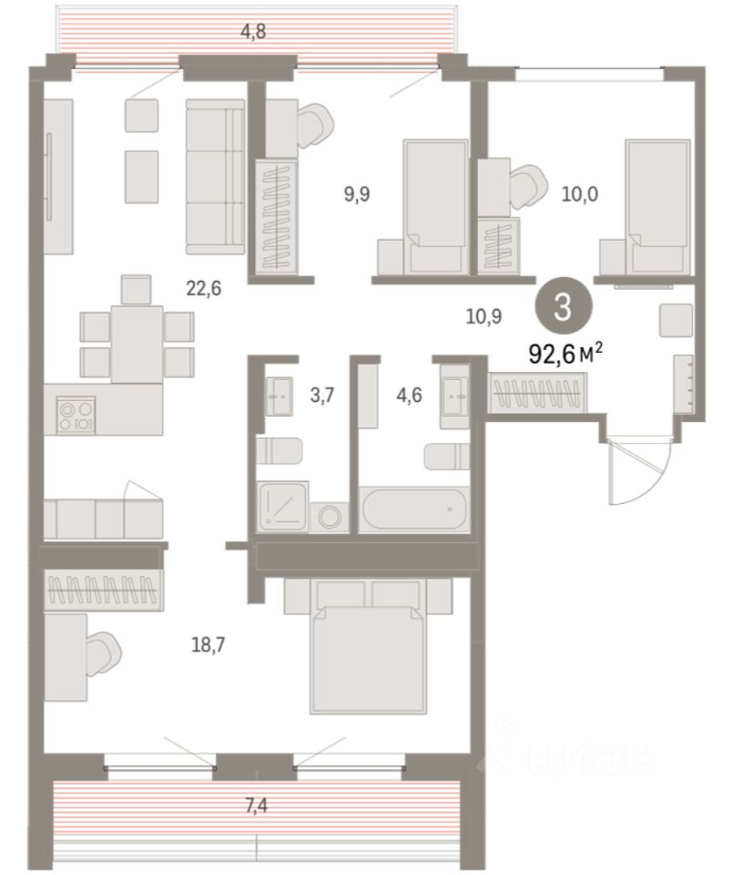 Квартира с кухней-гостиной и тремя спальнями в Бруснике в Академическом. Особенности планировки: окна на две стороны, второй санузел, разнесённые спальни, предчистовая отделка, балкон, терраса на крыше.