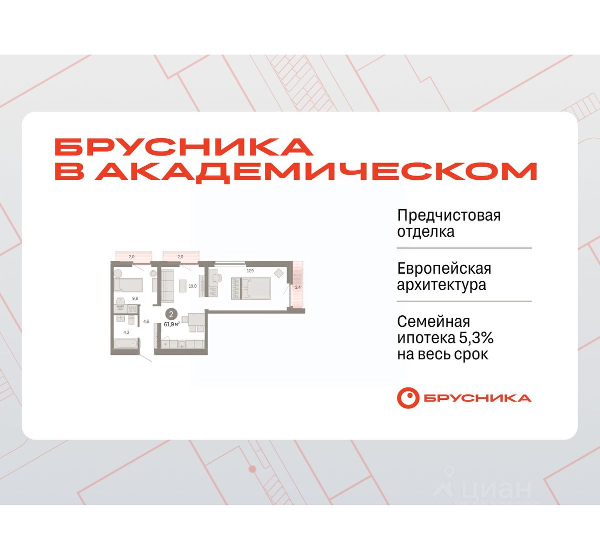 Квартира с кухней-гостиной и двумя спальнями в Бруснике в Академическом. Особенности планировки: лоджия, разнесённые спальни, предчистовая отделка, балкон.