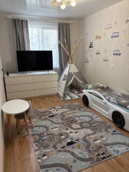 • Натяжные потолки в комнатах и на кухне, шкафы купе в коридоре и в детской спальне, теплый пол в ванной, кухонный гарнитур.