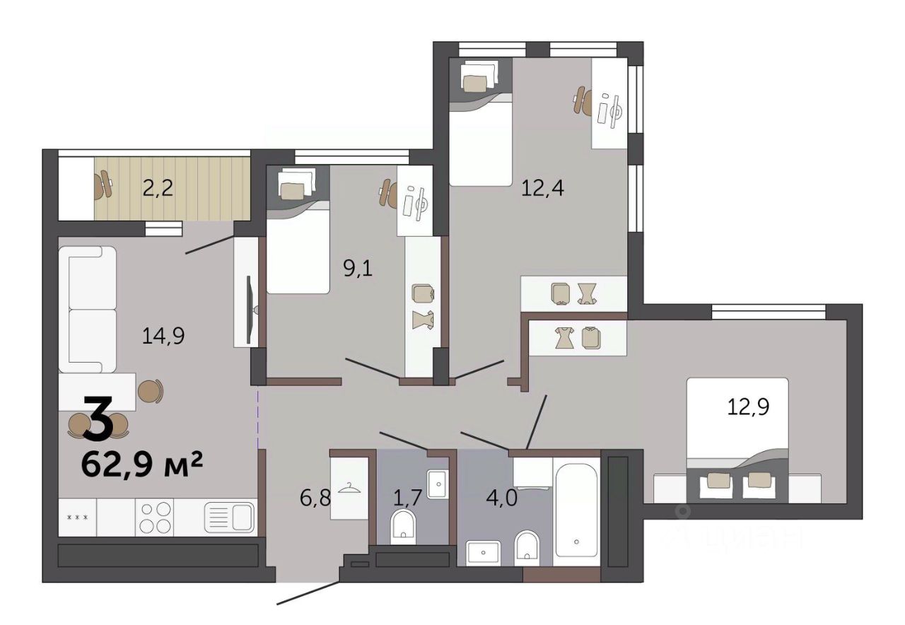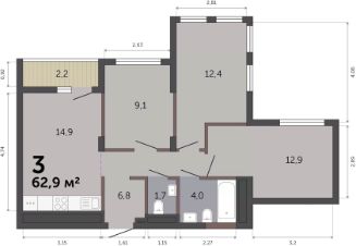 Продаётся 3-комнатная квартира в строящемся доме (Дом 6), срок сдачи: III-кв. 2027, общей площадью 62.9 кв.м., на 4 этаже. Расположение, транспортная доступность