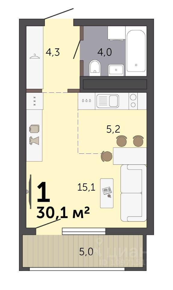 Продаётся студия в строящемся доме (Дом 6), срок сдачи: III-кв. 2027, общей площадью 30.1 кв.м., на 6 этаже. Расположение, транспортная доступность