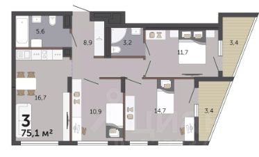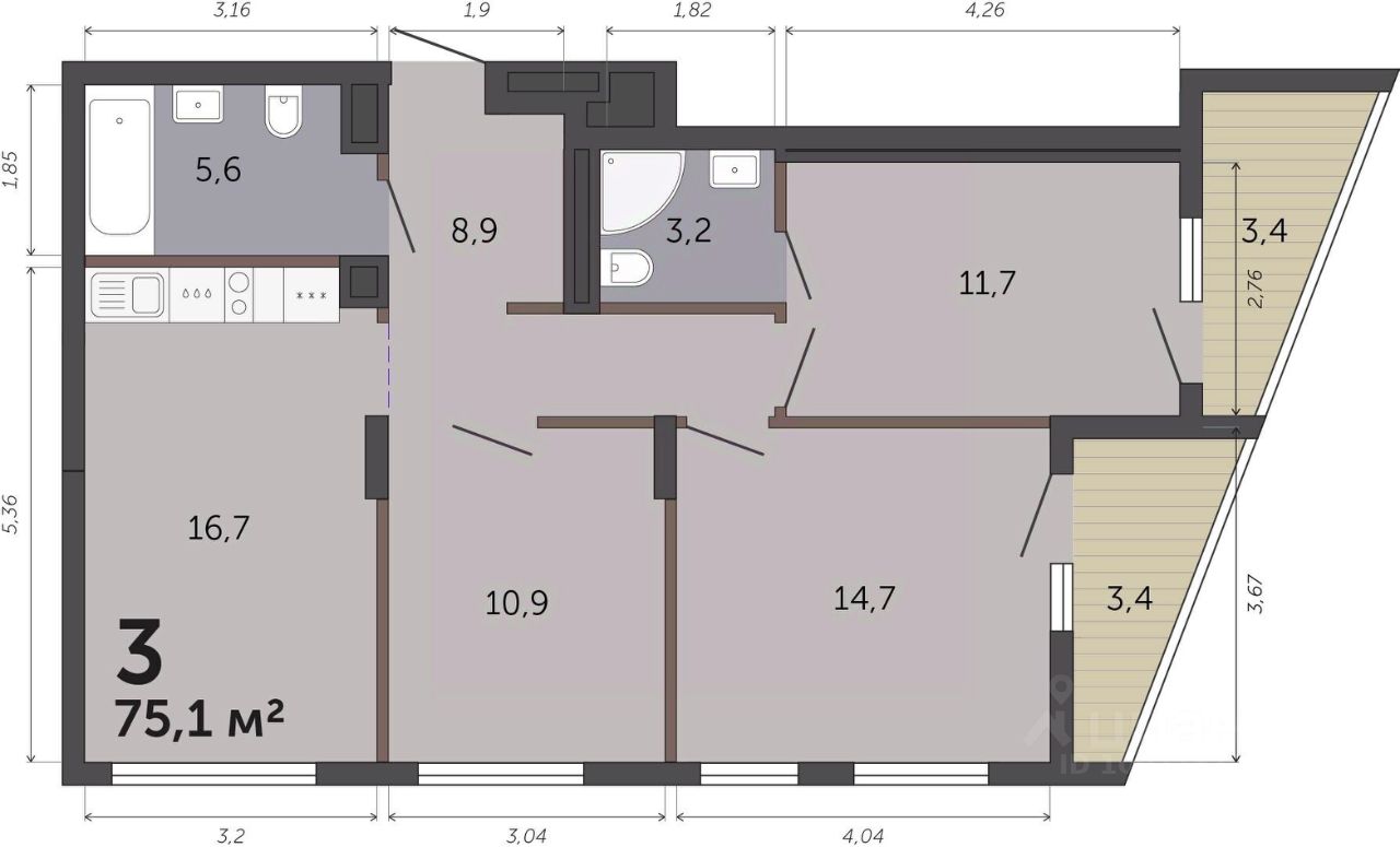 Продаётся 3-комнатная квартира в строящемся доме (Дом 6), срок сдачи: III-кв. 2027, общей площадью 75.1 кв.м., на 9 этаже. Расположение, транспортная доступность