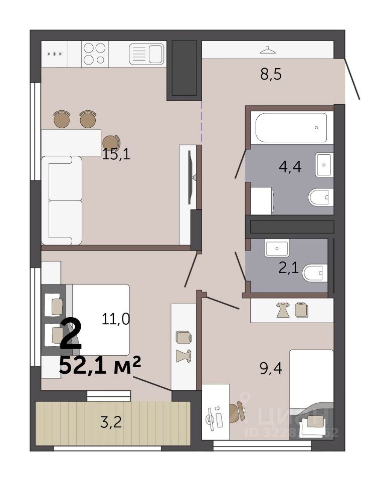 Продаётся 2-комнатная квартира в строящемся доме (Дом 6), срок сдачи: III-кв. 2027, общей площадью 52.1 кв.м., на 13 этаже. Расположение, транспортная доступность