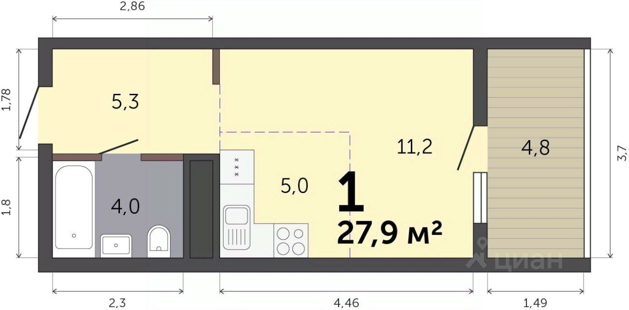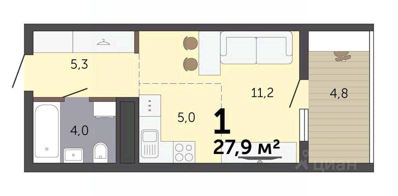 Продаётся студия в строящемся доме (Дом 6), срок сдачи: III-кв. 2027, общей площадью 27.9 кв.м., на 16 этаже. Расположение, транспортная доступность