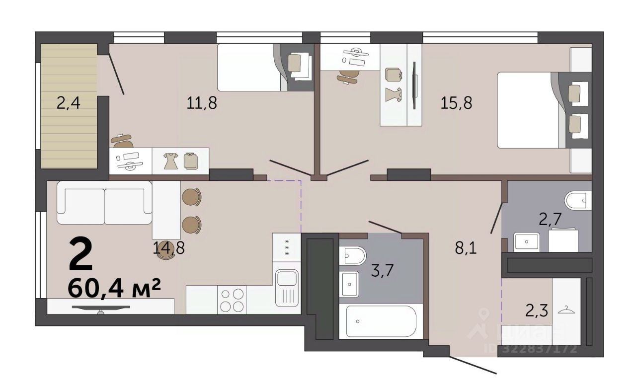 Продаётся 2-комнатная квартира в строящемся доме (Дом 6), срок сдачи: III-кв. 2027, общей площадью 60.4 кв.м., на 16 этаже. Расположение, транспортная доступность