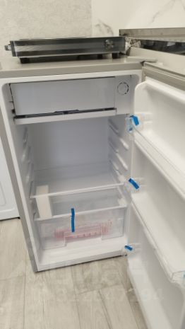 Светлая кухонная зона, вместительный кухонный гарнитур, качественным латунным смесителем, современный мини холодильник, сенсорная плитка.