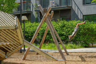 Оживлённое уличное движение останется за пределами квартала, а внутри создается собственная природная среда с зонами для вечерних прогулок, расслабленного отдыха, спорта и игр. Между домов проходит широкий пешеходный бульвар с разнообразным ландшафтом. Он объединяет общественные пространства между кварталами и переходит в площадь-сквер с фонтаном.