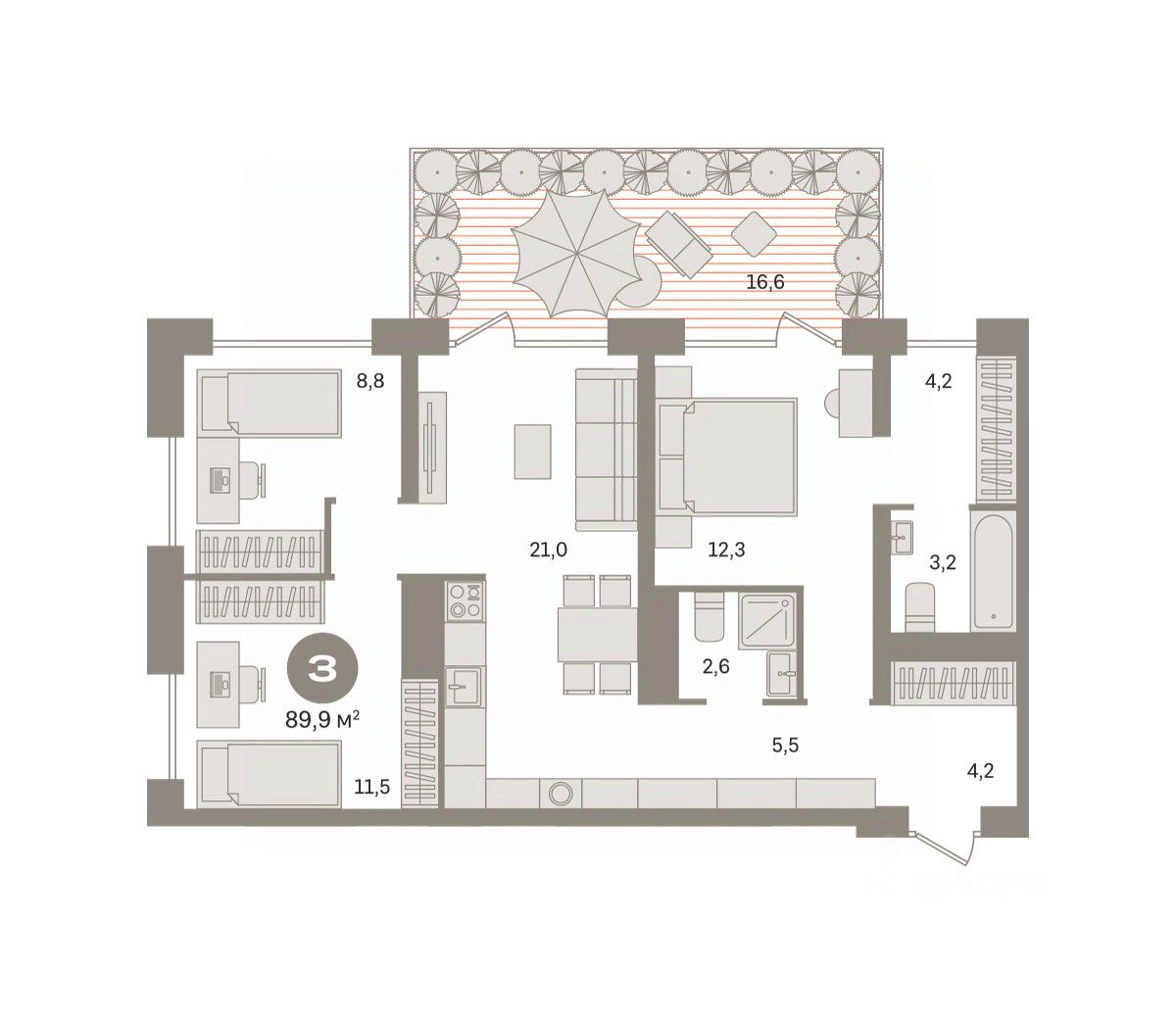 Квартира с кухней-гостиной и тремя спальнями в Северном квартале. Особенности планировки: гардеробная, вид во двор, предчистовая отделка, мастер-спальня, терраса.