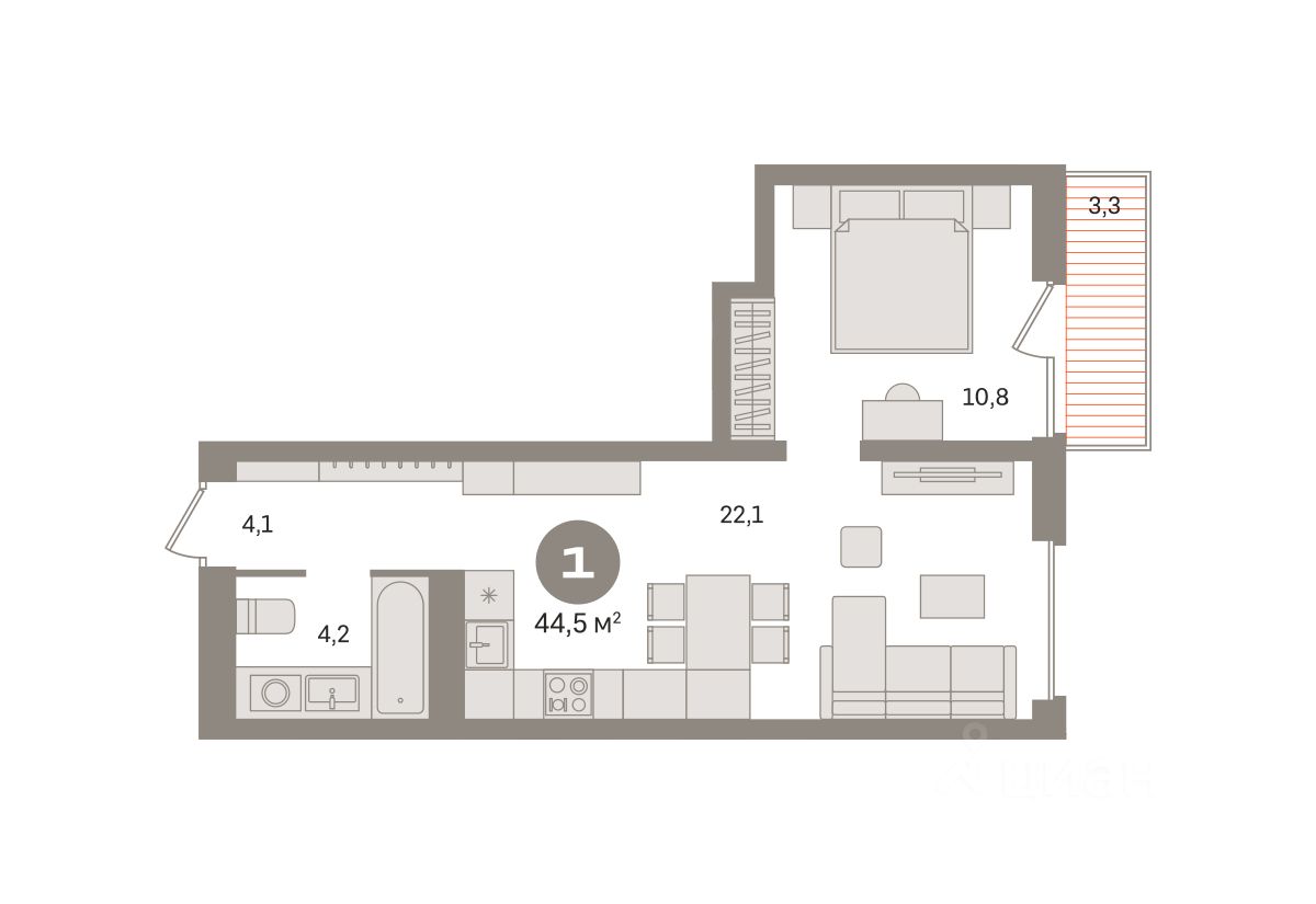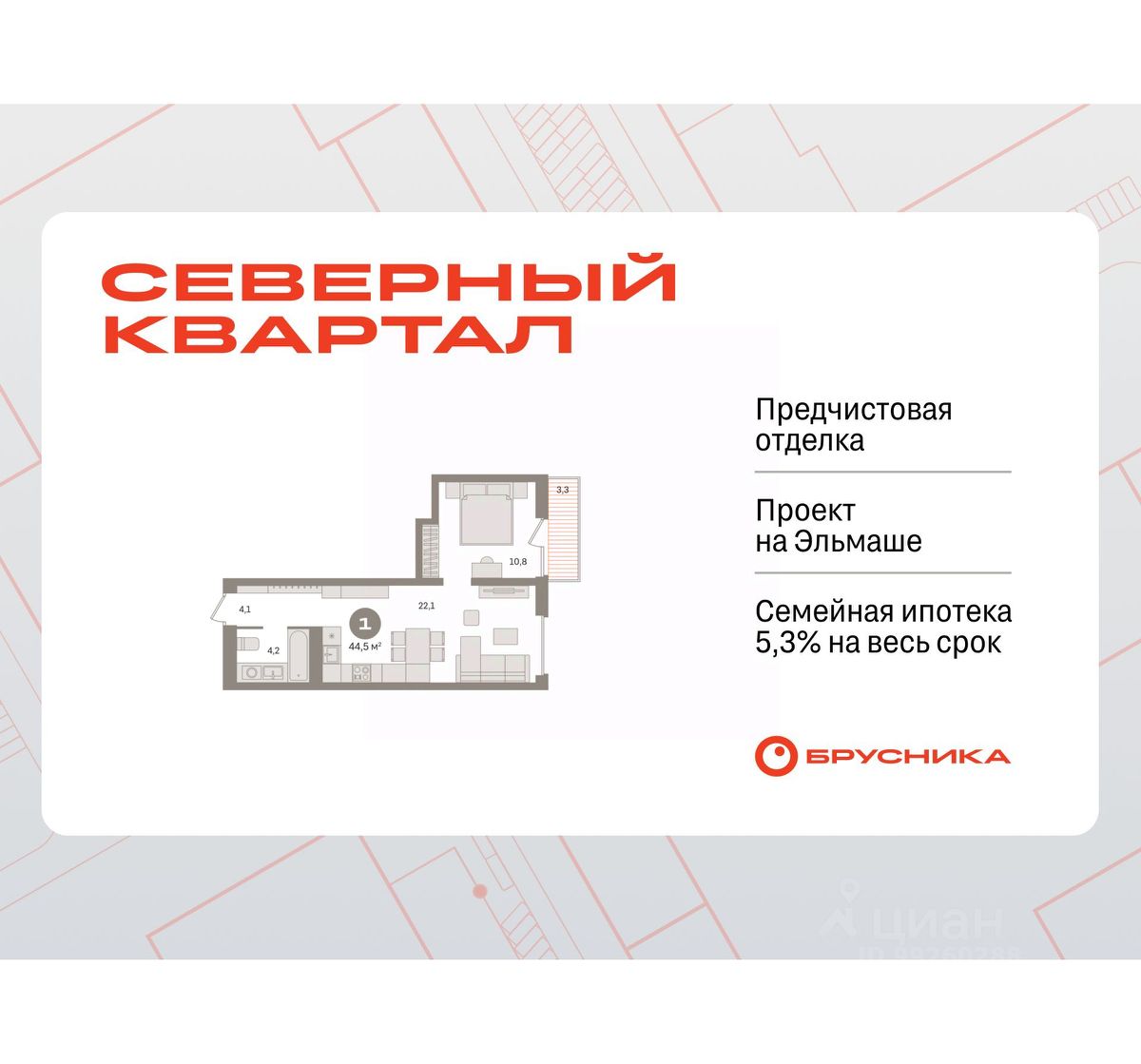 Квартира с кухней-гостиной и одной спальней в Северном квартале. Особенности планировки: предчистовая отделка, балкон.