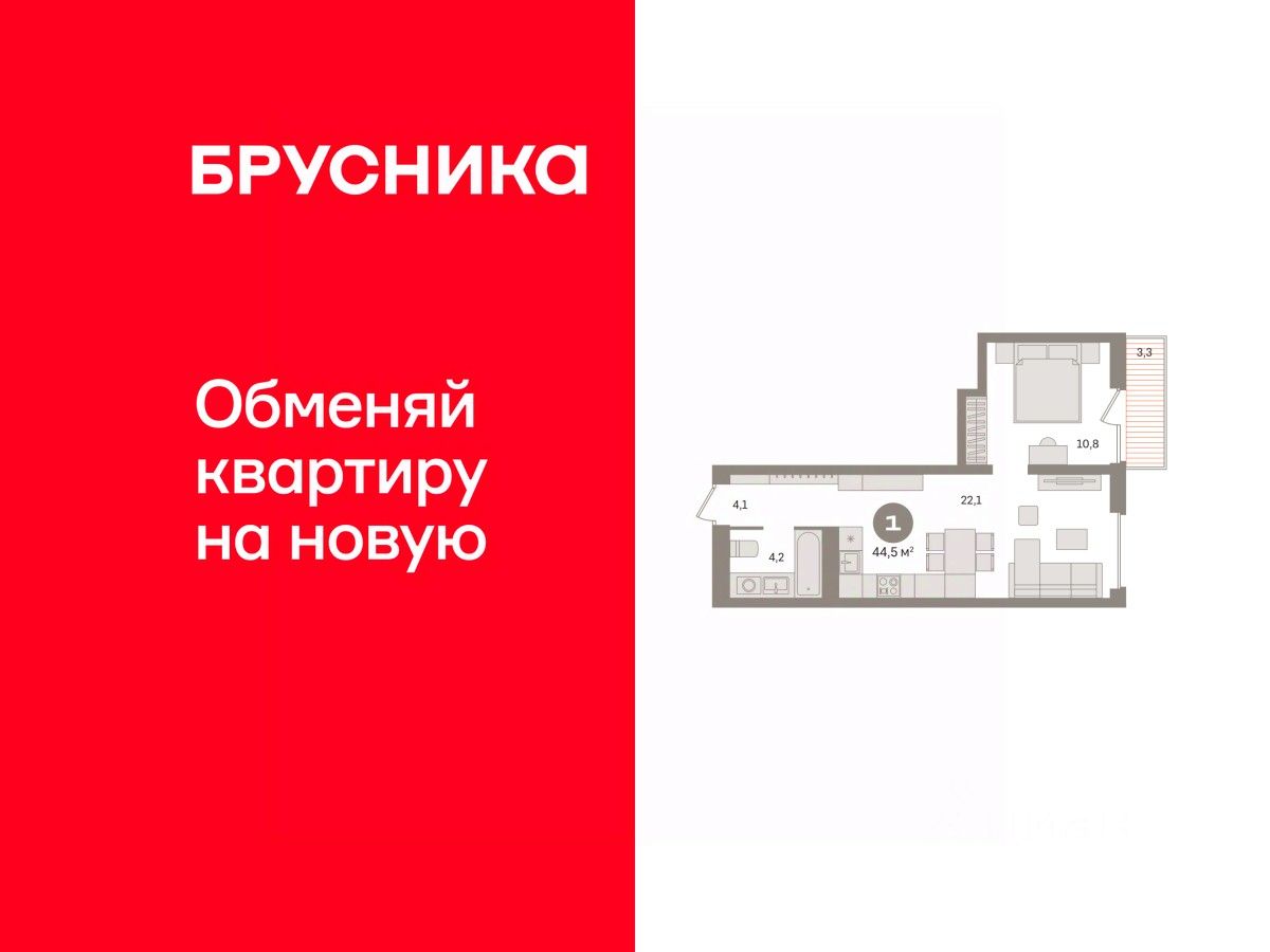 Квартира с кухней-гостиной и одной спальней в Северном квартале. Особенности планировки: балкон, предчистовая отделка.