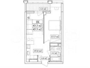 * Планировка: кухня-гостиная 19,5 кв.м. с выходом на лоджию, спальня 15,5 кв.м., санузел 4,5 кв.м., коридор с нишей под шкаф-купе 5 кв.м.