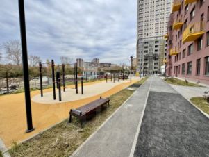 большой зеленый двор-парк с площадкой для воркаута, игровыми и прогулочными зонами;