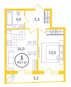 Общая площадь: 43,7 кв. м., жилая: 38,49 кв. м., площадь просторной кухни-столовой: 16 кв. м.
