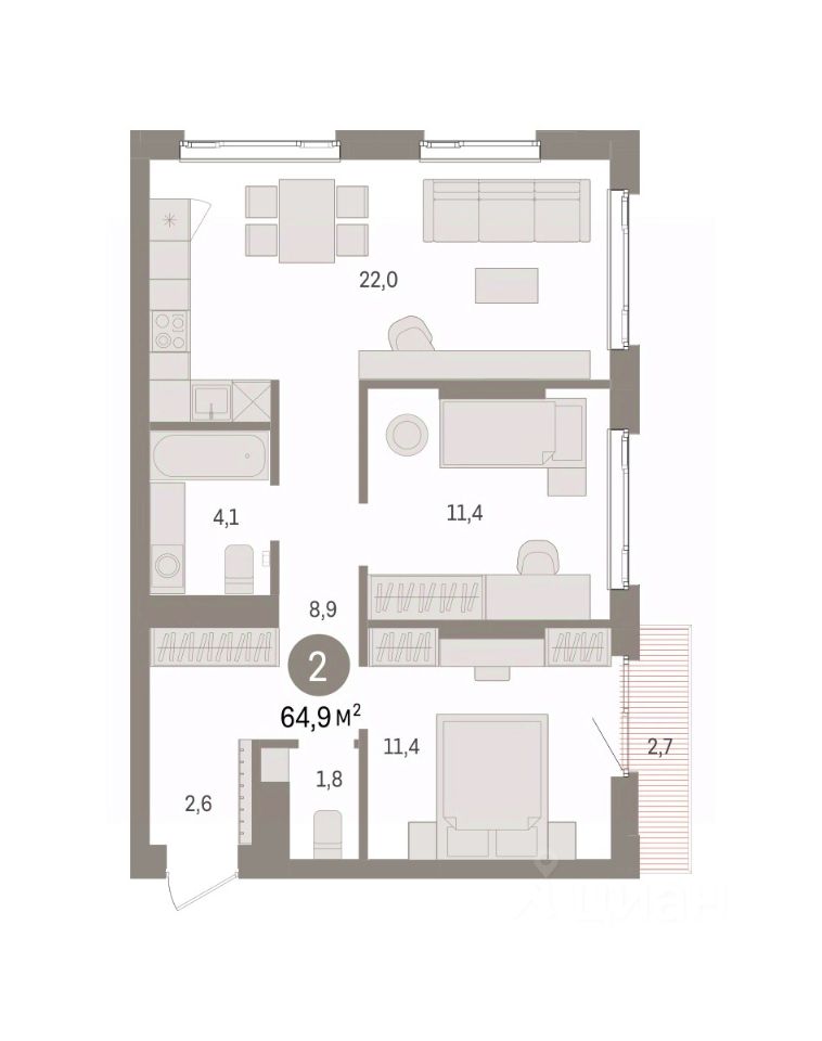 Квартира с кухней-гостиной и двумя спальнями в квартале "Траектория". Особенности планировки: балкон, второй санузел, предчистовая отделка, разнесённые спальни, стартовая цена.