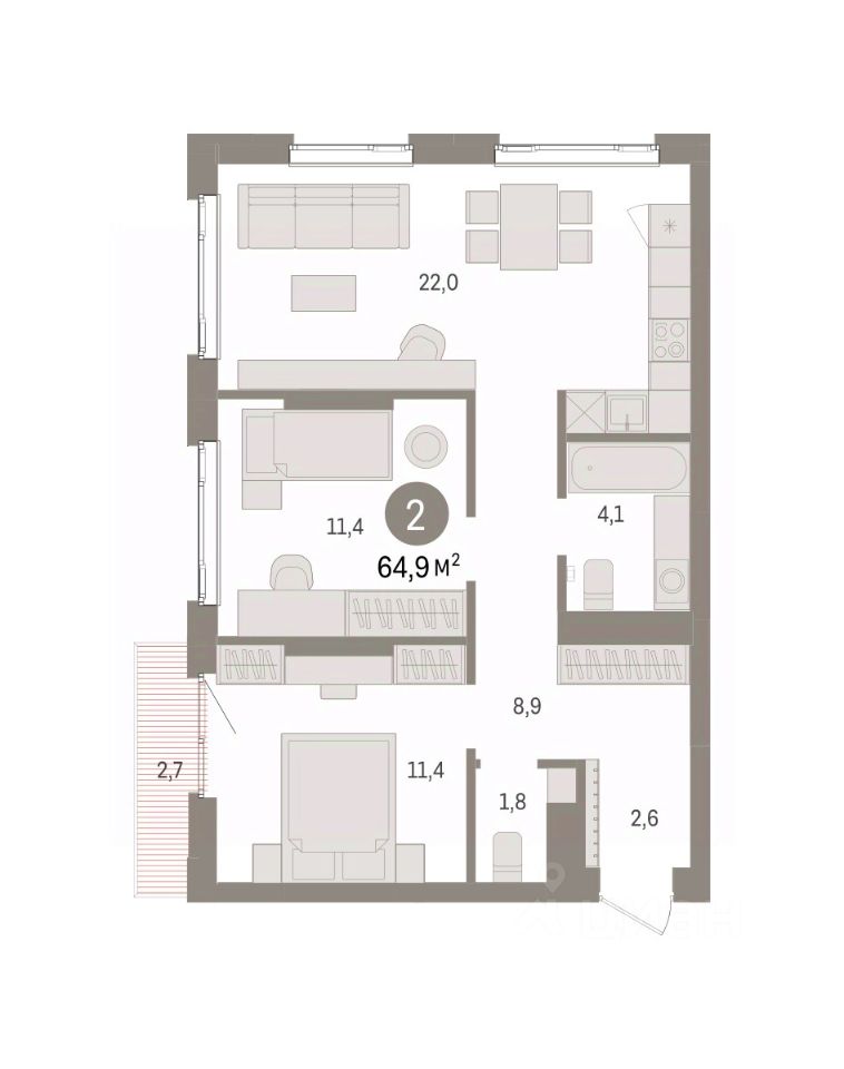 Продается 2-комн. квартира от застройщика с предчистовой отделкой в ЖК "Квартал Траектория" на 8 этаже. Общая площадь: 64.9 кв.м., жилая: 22.3 кв.м., площадь просторной кухни-столовой: 22.2 кв.м. Квартира угловая, окна oбecпeчивaют paвнoмepнoe ocвeщeниe в тeчeниe дня. В квартире два балкона, два совмещенных санузла. Высота потолков 2.82 м.