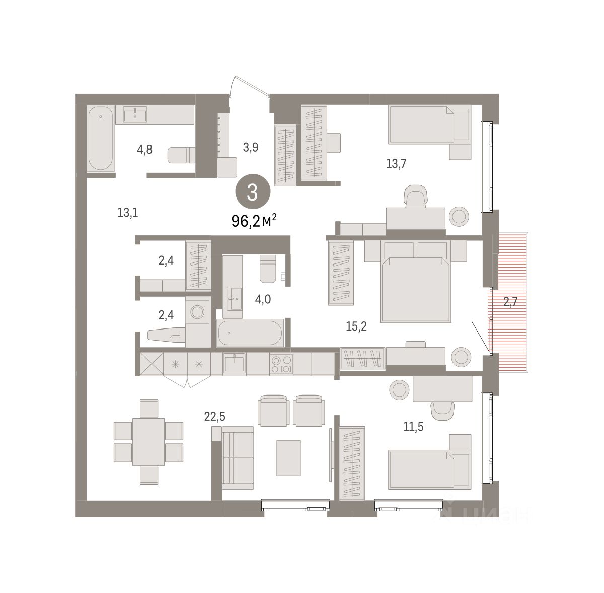 Квартира с кухней-гостиной и тремя спальнями в квартале "Траектория". Особенности планировки: гардеробная, стартовая цена, разнесённые спальни, предчистовая отделка, мастер-спальня, постирочная, балкон.