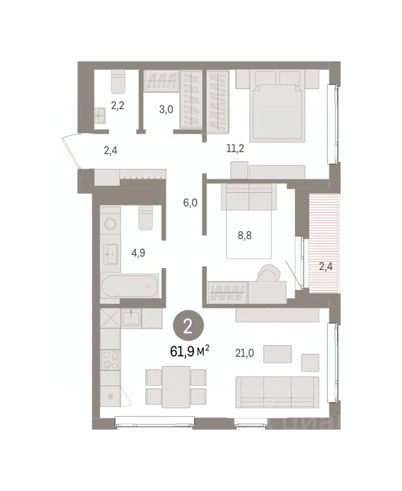 Квартира с кухней-гостиной и двумя спальнями в квартале "Траектория". Особенности планировки: второй санузел, гардеробная, стартовая цена, лоджия, разнесённые спальни, предчистовая отделка.