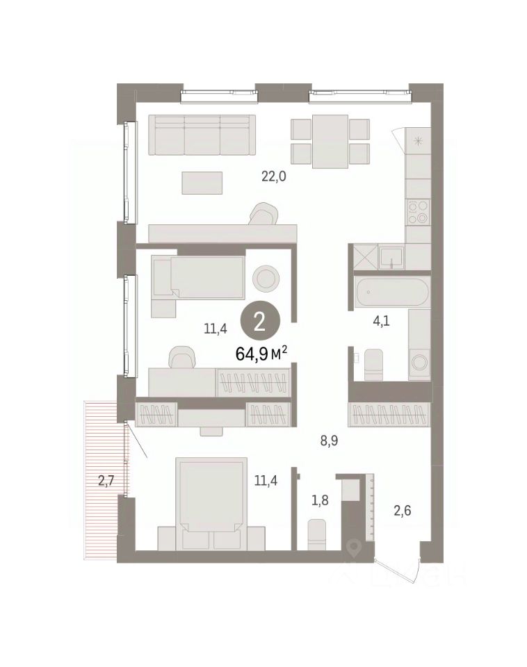 Квартира с кухней-гостиной и двумя спальнями в квартале "Траектория". Особенности планировки: второй санузел, стартовая цена, разнесённые спальни, предчистовая отделка, балкон.