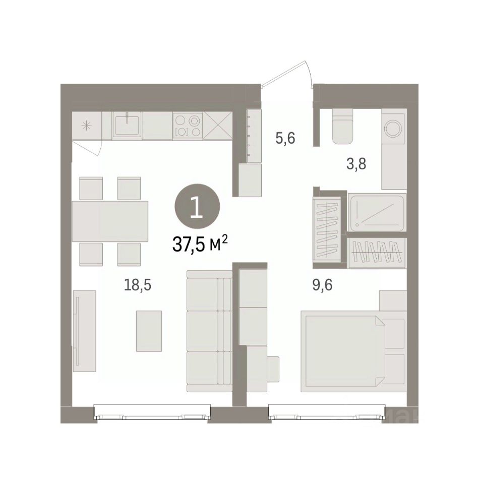 1-комн. квартира с предчистовой отделкой в ЖК "Квартал Траектория" на 3 этаже. Общая площадь: 37.5 кв.м., жилая: 9.6 кв.м., площадь просторной кухни-столовой: 18.5 кв.м. Все окна выходят на одну сторону. В квартире один совмещенный санузел. Высота потолков 2.82 м.