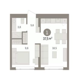 Просторная 1-комн. квартира с предчистовой отделкой в ЖК "Квартал Траектория" на 3 этаже. Общая площадь: 37.5 кв.м., жилая: 9.6 кв.м., площадь просторной кухни-столовой: 18.5 кв.м. Все окна выходят на одну сторону. В квартире один совмещенный санузел. Высота потолков 2.82 м.