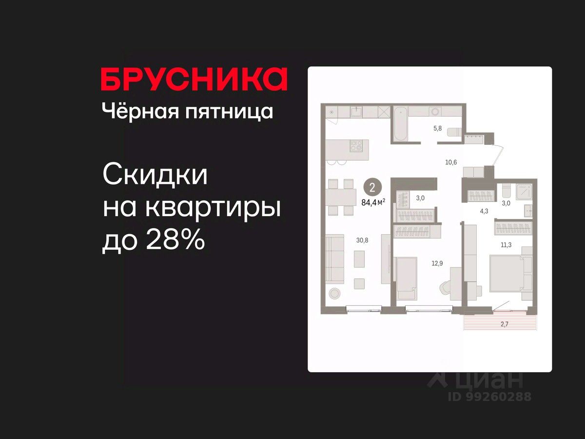 Двухкомнатная квартира от застройщика с предчистовой отделкой в ЖК "Квартал Траектория" на 3 этаже. Общая площадь: 84.4 кв.м., жилая: 24.2 кв.м., площадь просторной кухни-столовой: 30.8 кв.м. Комнаты изолированные, все окна выходят на одну сторону. В квартире один балкон, два совмещенных санузла. Высота потолков 2.82 м.