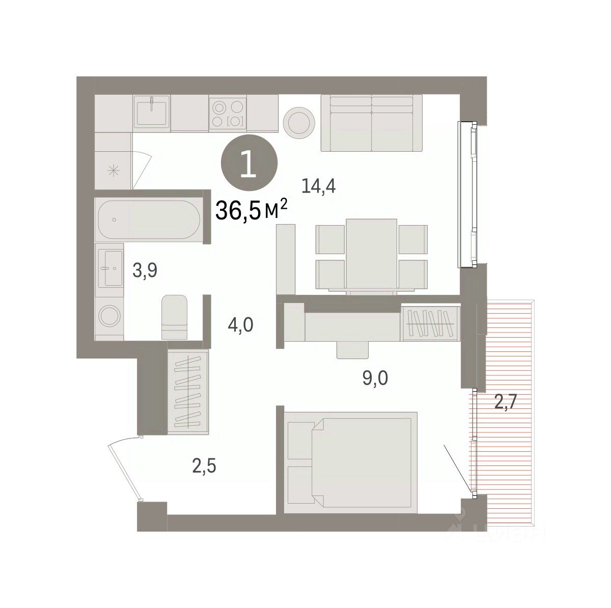 Продается 1-комн. квартира от застройщика с предчистовой отделкой в ЖК "Квартал Траектория" на 4 этаже. Общая площадь: 36.5 кв.м., жилая: 9 кв.м., площадь просторной кухни-столовой: 14.4 кв.м. Все окна выходят на одну сторону. В квартире один балкон, один совмещенный санузел. Высота потолков 2.82 м.