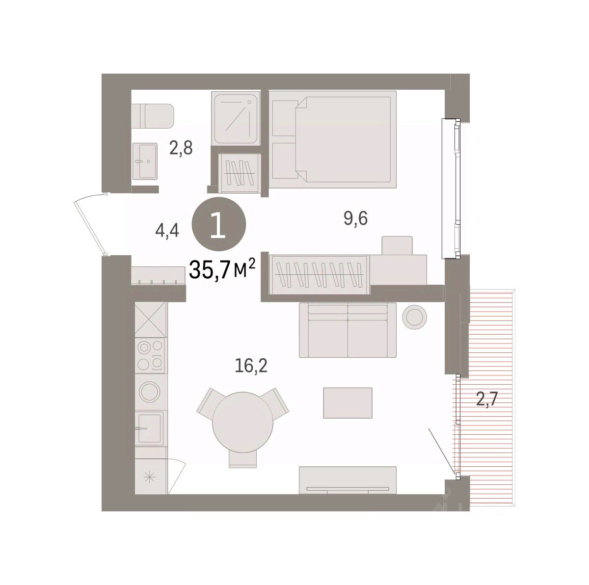 Квартира с кухней-гостиной и одной спальней в квартале "Траектория". Особенности планировки: вид во двор, предчистовая отделка, балкон.