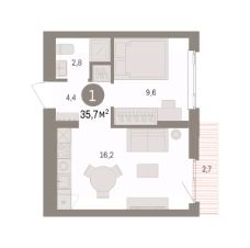 Просторная однокомнатная квартира с предчистовой отделкой в ЖК "Квартал Траектория" на 5 этаже. Общая площадь: 35.7 кв.м., жилая: 9.6 кв.м., площадь просторной кухни-столовой: 16.2 кв.м. Все окна выходят на одну сторону. В квартире один балкон, один совмещенный санузел. Высота потолков 2.82 м.