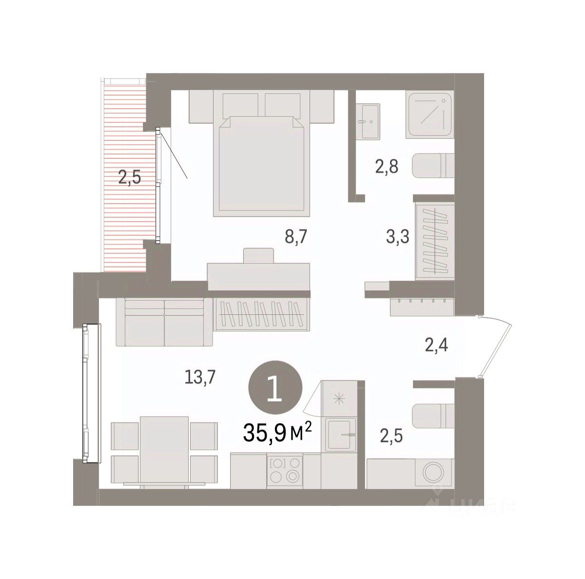 Квартира с кухней-гостиной и одной спальней в квартале "Траектория". Особенности планировки: гардеробная, предчистовая отделка, мастер-спальня, терраса на крыше.