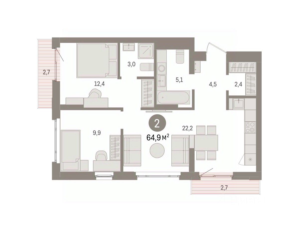 Квартира с кухней-гостиной и двумя спальнями в квартале "Траектория". Особенности планировки: стартовая цена, разнесённые спальни, предчистовая отделка, мастер-спальня, балкон.