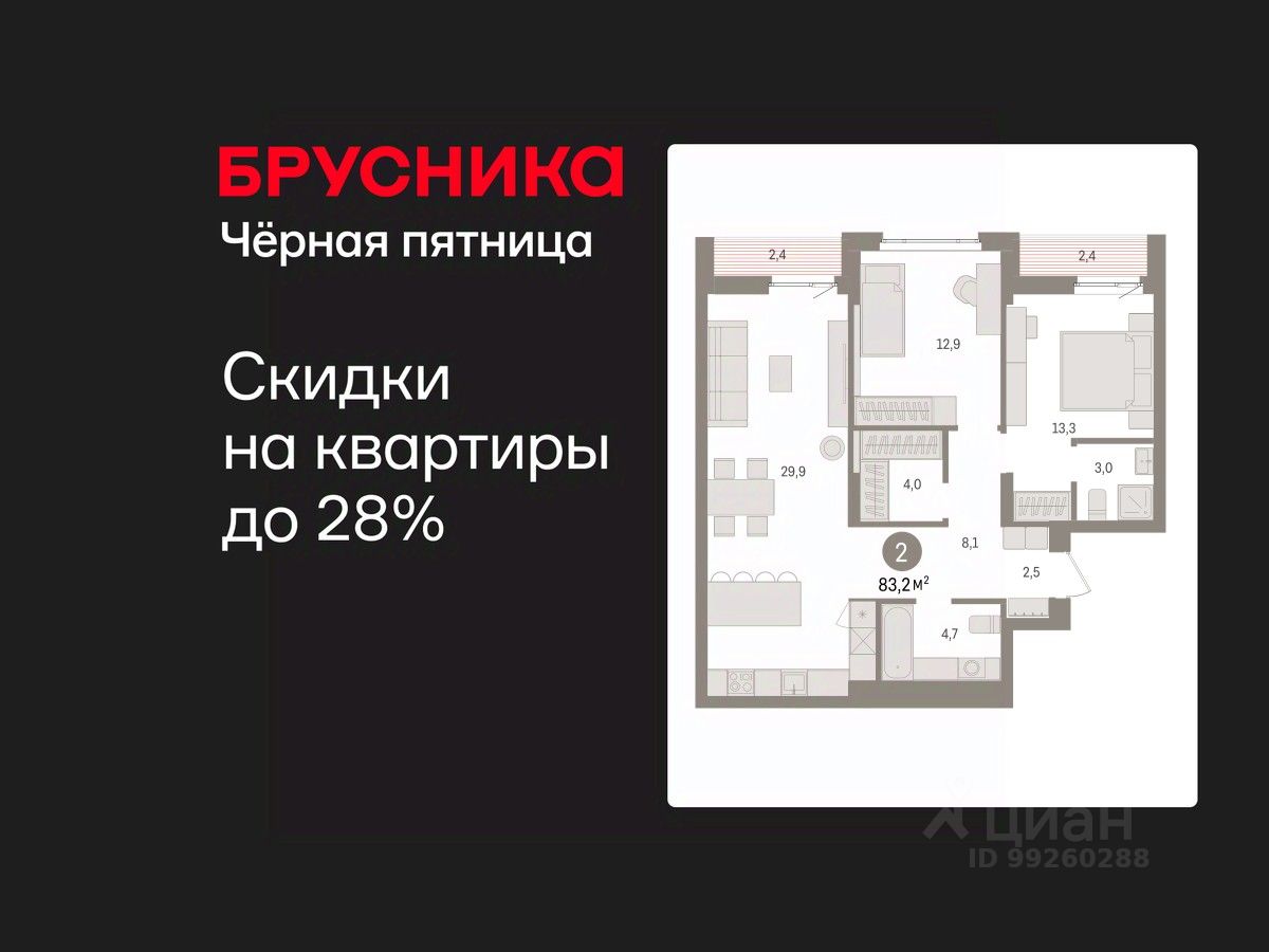 Продается 2-комн. квартира с предчистовой отделкой в ЖК "Квартал Траектория" на 8 этаже. Общая площадь: 83.2 кв.м., жилая: 26.2 кв.м., площадь просторной кухни-столовой: 29.9 кв.м. Комнаты изолированные, все окна выходят на одну сторону. В квартире две лоджии, два совмещенных санузла. Высота потолков 2.82 м.