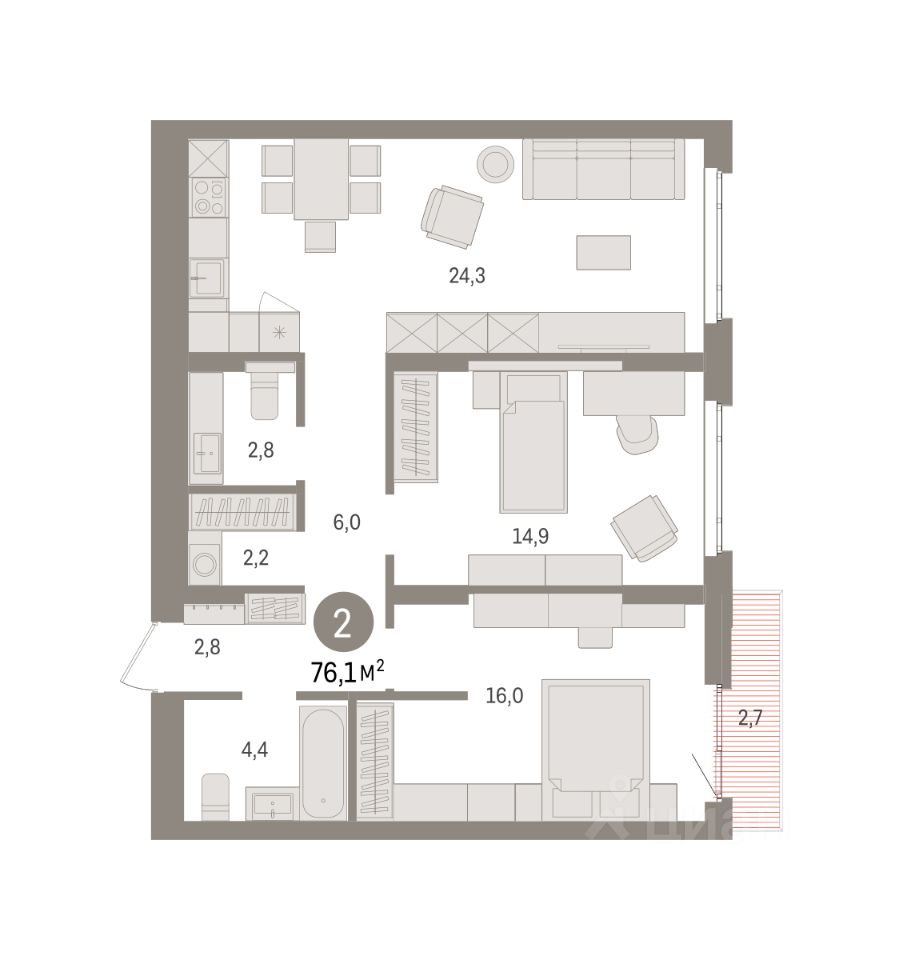 Квартира с кухней-гостиной и двумя спальнями в квартале "Траектория". Особенности планировки: второй санузел, гардеробная, стартовая цена, вид во двор, разнесённые спальни, предчистовая отделка, балкон.