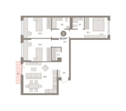 Просторная трехкомнатная квартира с предчистовой отделкой в ЖК "Квартал Траектория" на 3 этаже. Общая площадь: 93.9 кв.м. Высота потолков 2.82 м.