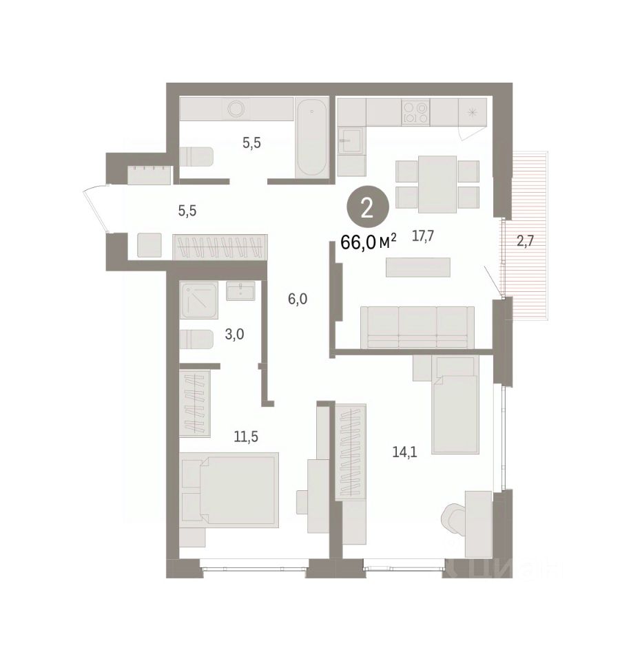 Просторная 2-комн. квартира с предчистовой отделкой в ЖК "Квартал Траектория" на 5 этаже. Общая площадь: 66 кв.м., жилая: 25.6 кв.м., площадь просторной кухни-столовой: 17.7 кв.м. Угловая квартира, очень светлая, естественная вентиляция при открытии окон. В квартире один балкон, два совмещенных санузла. Высота потолков 2.82 м.