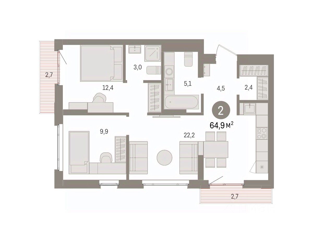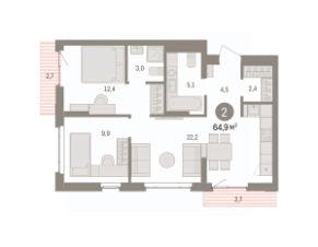 Квартира с кухней-гостиной и двумя спальнями в квартале "Траектория". Особенности планировки: стартовая цена, разнесённые спальни, предчистовая отделка, мастер-спальня, балкон.