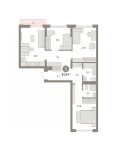 Продается трехкомнатная квартира с предчистовой отделкой в ЖК "Квартал Траектория" на 3 этаже. Общая площадь: 83.3 кв.м. Высота потолков 2.82 м.