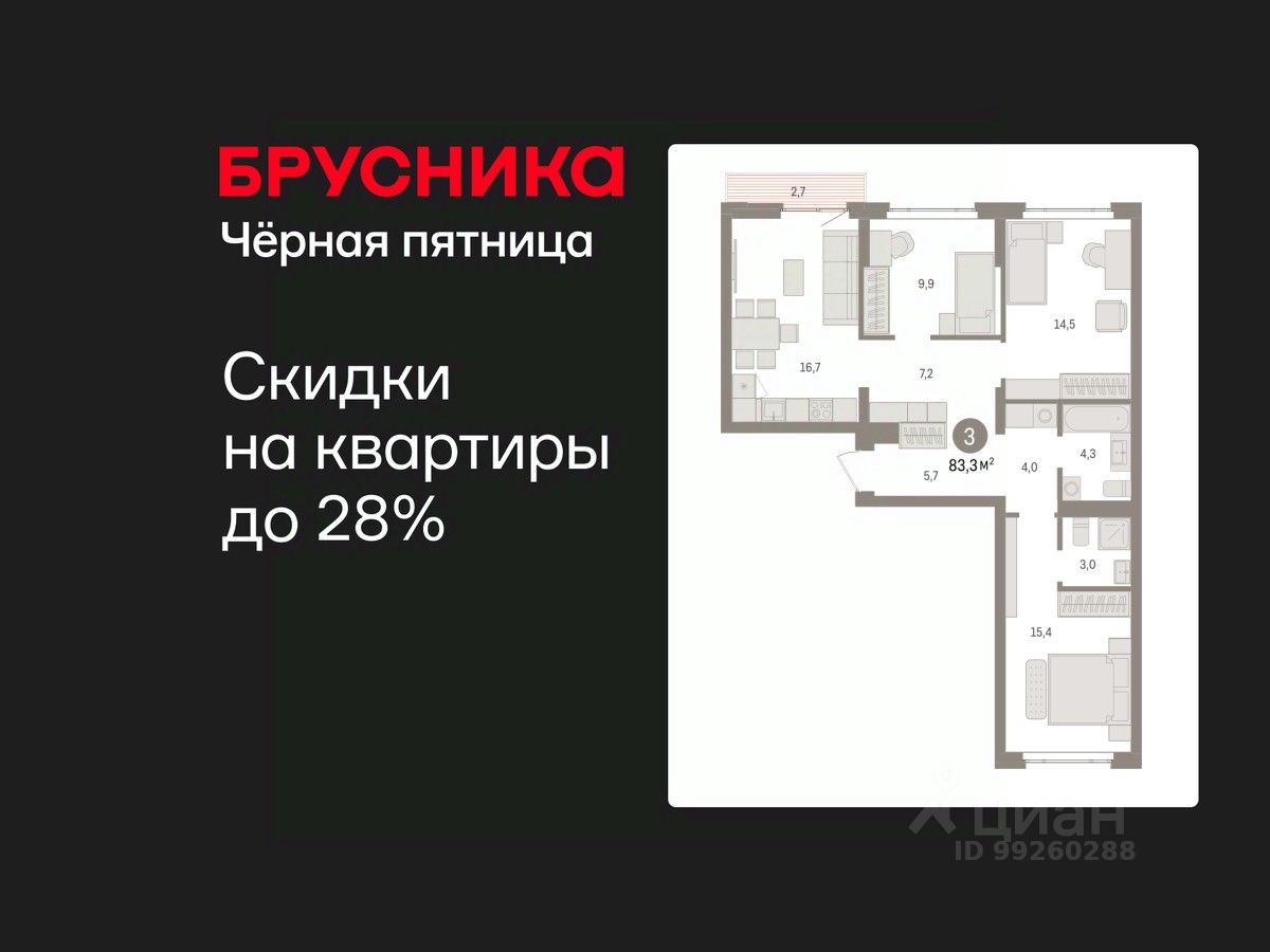 3-комн. квартира с предчистовой отделкой в ЖК "Квартал Траектория" на 3 этаже. Общая площадь: 83.3 кв.м., жилая: 39.8 кв.м., площадь просторной кухни-столовой: 16.7 кв.м. Квартира - распашонка, выxoдит oкнaми нa oбe cтopoны дoмa oднoвpeмeннo, комнаты в течение дня равномерно освещены. В квартире один балкон, два совмещенных санузла. Высота потолков 2.82 м.