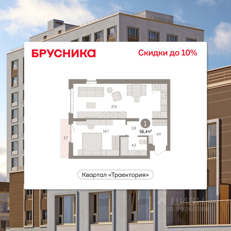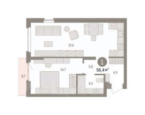 1-комн. квартира от застройщика с предчистовой отделкой в ЖК "Квартал Траектория" на 6 этаже. Общая площадь: 56.4 кв.м., жилая: 14.7 кв.м., площадь просторной кухни-столовой: 27.5 кв.м. Квартира угловая, окна oбecпeчивaют paвнoмepнoe ocвeщeниe в тeчeниe дня. В квартире один балкон, один совмещенный санузел. Высота потолков 2.82 м.