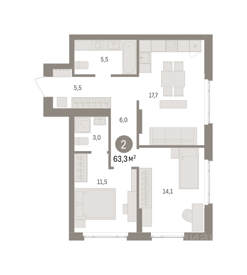 Продается двухкомнатная квартира с предчистовой отделкой в ЖК "Квартал Траектория" на 2 этаже. Общая площадь: 63.3 кв.м., жилая: 25.6 кв.м., площадь просторной кухни-столовой: 17.7 кв.м. Угловая квартира, очень светлая, естественная вентиляция при открытии окон. В квартире два совмещенных санузла. Высота потолков 2.82 м.