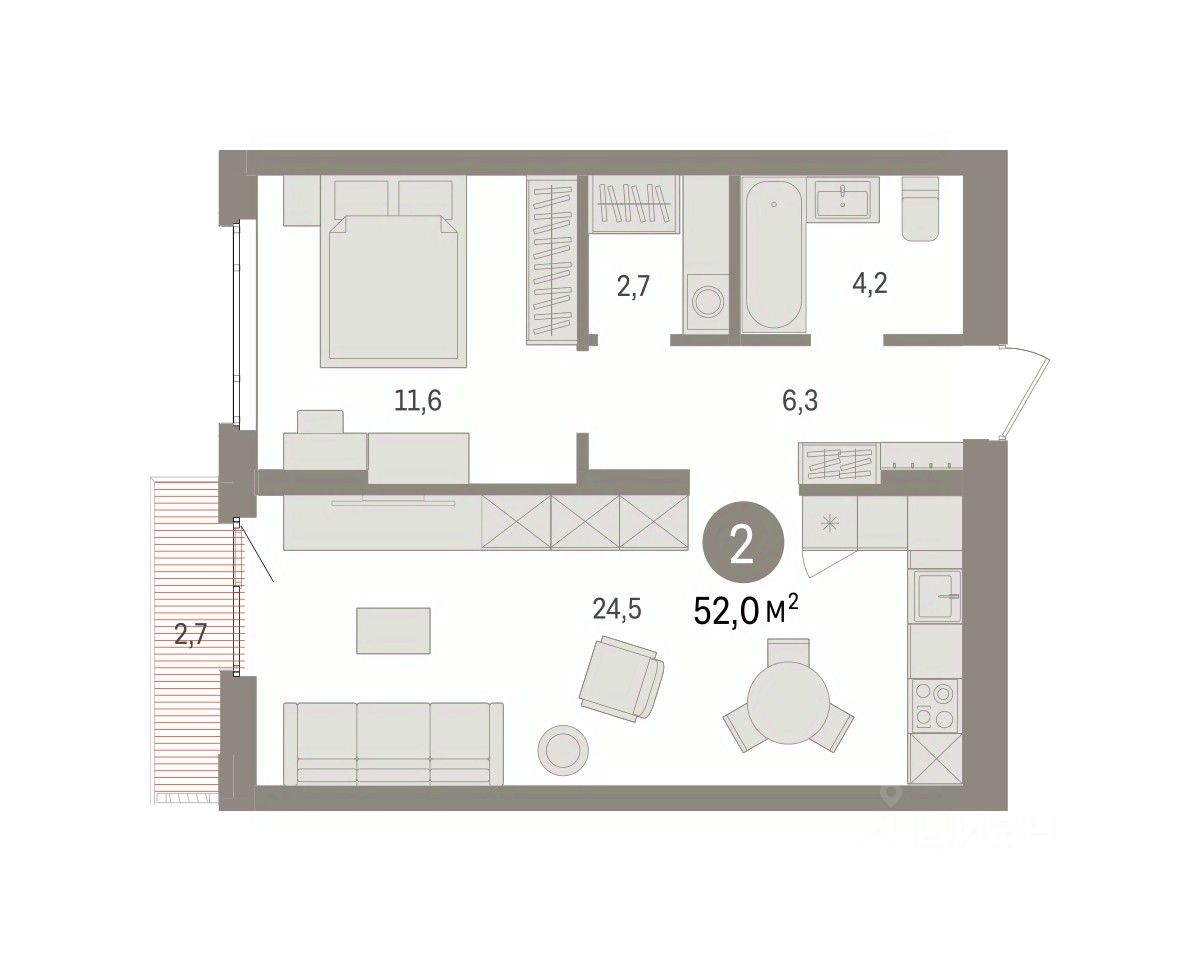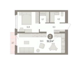 1-комн. квартира с предчистовой отделкой в ЖК "Квартал Траектория" на 8 этаже. Общая площадь: 52 кв.м., жилая: 11.6 кв.м., площадь просторной кухни-столовой: 24.5 кв.м. Все окна выходят на одну сторону. В квартире один балкон, один совмещенный санузел. Высота потолков 2.82 м.