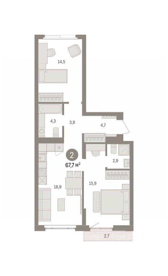 Квартира с кухней-гостиной и двумя спальнями в квартале "Траектория". Особенности планировки: окна на две стороны, окна в пол, стартовая цена, вид во двор, панорамное остекление, разнесённые спальни, предчистовая отделка, мастер-спальня, балкон.