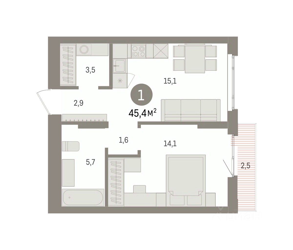 1-комн. квартира от застройщика с предчистовой отделкой в ЖК "Квартал Траектория" на 4 этаже. Общая площадь: 45.4 кв.м., жилая: 14.1 кв.м., площадь просторной кухни-столовой: 15.1 кв.м. Все окна выходят на одну сторону. В квартире один балкон, один совмещенный санузел. Высота потолков 2.82 м.