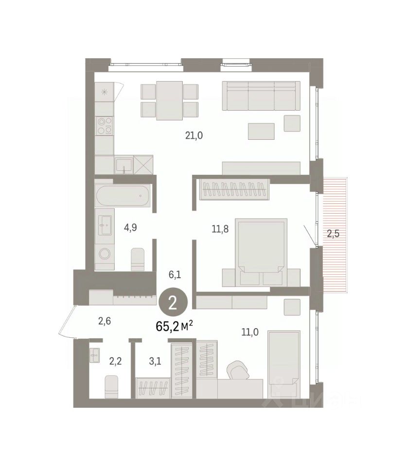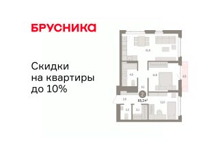 2-комн. квартира с предчистовой отделкой в ЖК "Квартал Траектория" на 4 этаже. Общая площадь: 65.2 кв.м., жилая: 22.8 кв.м., площадь просторной кухни-столовой: 21 кв.м. Квартира угловая, окна oбecпeчивaют paвнoмepнoe ocвeщeниe в тeчeниe дня. В квартире один балкон, один совмещенный и один раздельный санузел. Высота потолков 2.82 м.