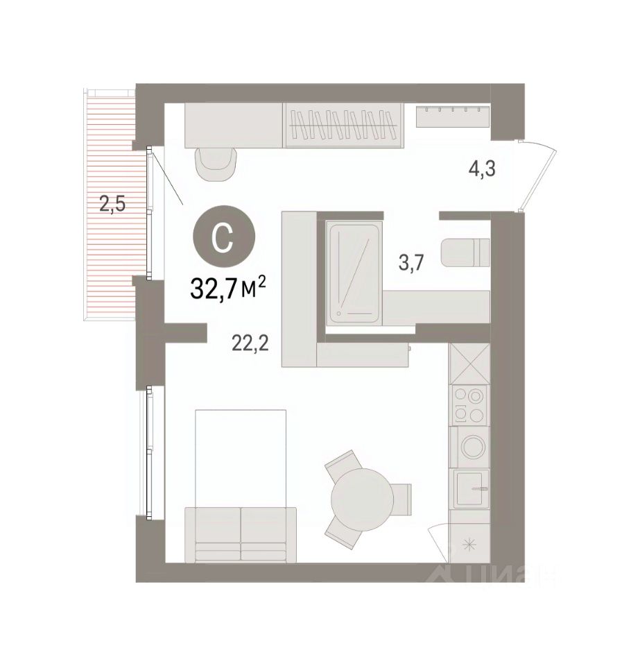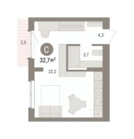 Однокомнатная студия от застройщика с предчистовой отделкой в ЖК "Квартал Траектория" на 7 этаже. Общая площадь: 32.7 кв.м., площадь гостиной 22.2 кв.м., из которых 5 кв.м. выделено под кухонную зону. Все окна выходят на одну сторону. В квартире один балкон, один совмещенный санузел. Высота потолков 2.82 м.