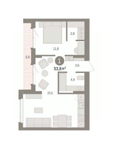 1-комн. квартира от застройщика с предчистовой отделкой в ЖК "Квартал Траектория" на 6 этаже. Общая площадь: 53.8 кв.м., жилая: 11.6 кв.м., площадь просторной кухни-столовой: 27.4 кв.м. Все окна выходят на одну сторону. В квартире одна лоджия, один совмещенный санузел. Высота потолков 2.82 м.
